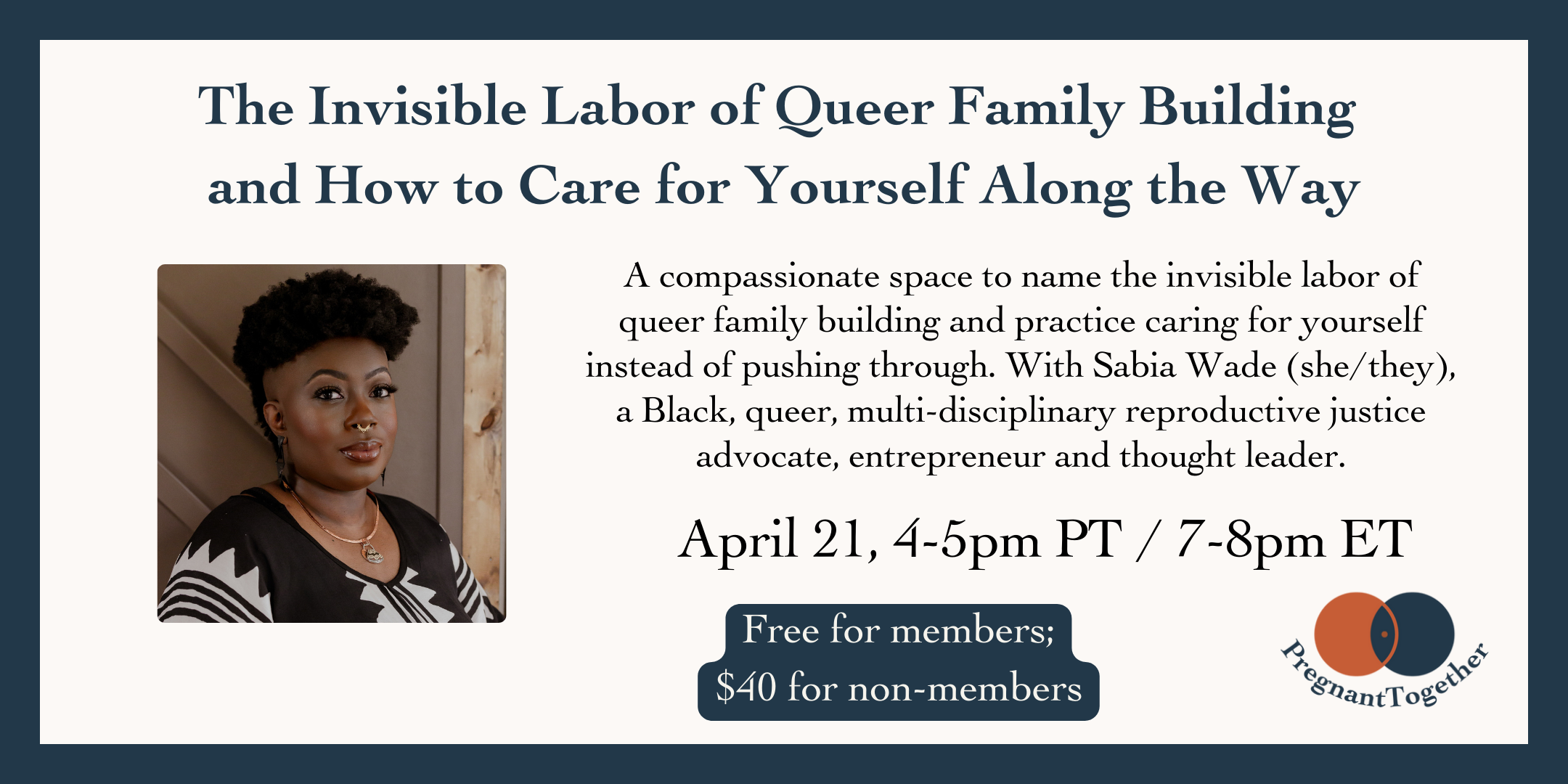 Note: your first two weeks of membership to our PregnantTogether community is FREE and only $20/mo thereafter with no commitment. This and all future events are always free for community members. In the community you can connect with other pregnant people or folks trying to conceive, receive advice for your virtual midwife (me!) and attend all PregnantTogether events and workshops like this one for free! You’ll also get access to TONS of recorded resources that will make this journey less overwhelming. The community is a nurturing, resourceful, and safe place for queer folks, solo parents, and anyone who has ever felt like they don’t belong in the dominant narrative of what “family” should be.