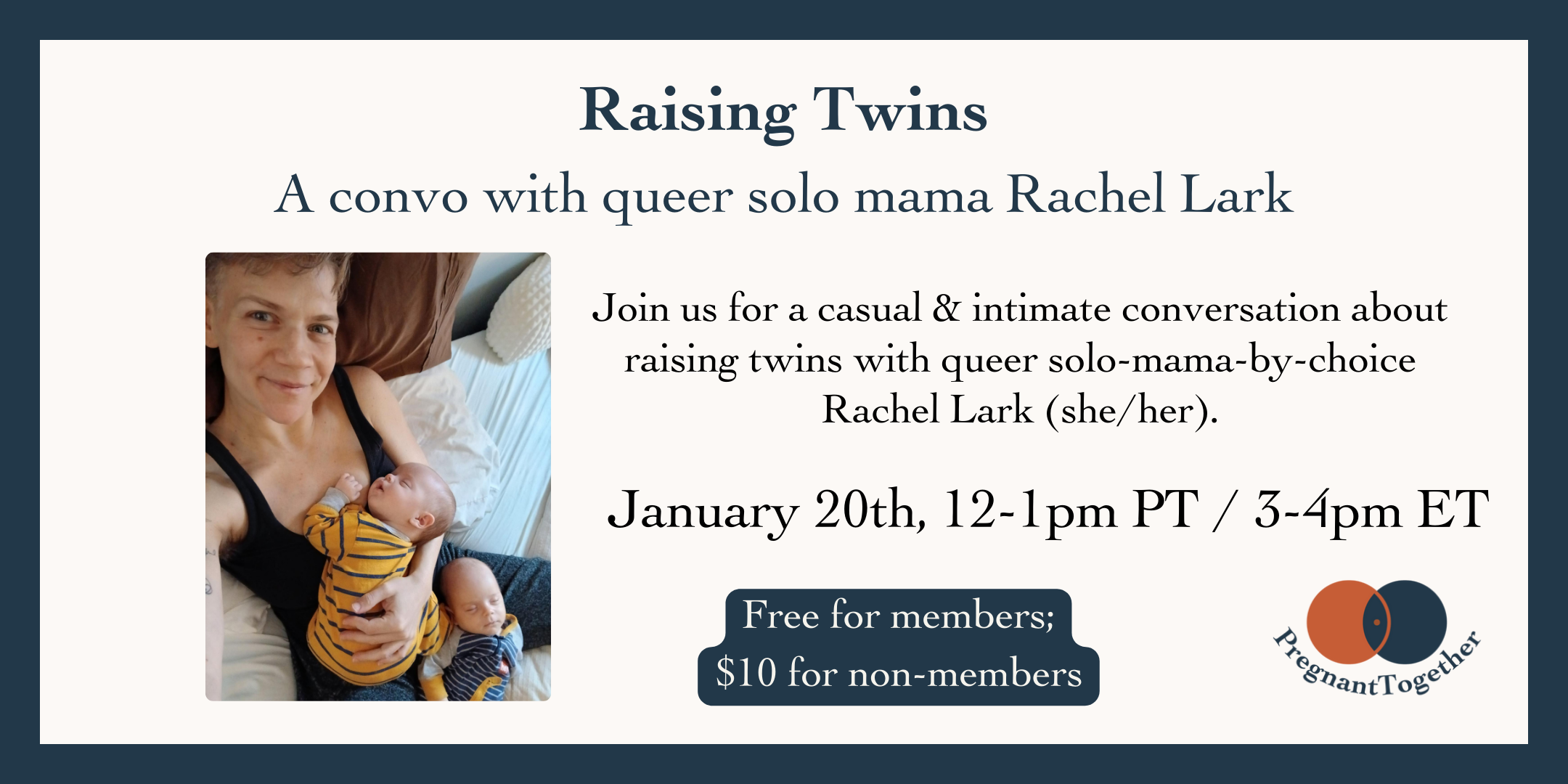 Join us for a casual conversation with queer solo mama by choice Rachel Lark (she/her) on how she's raising twins as a solo parent and getting community support in the process.