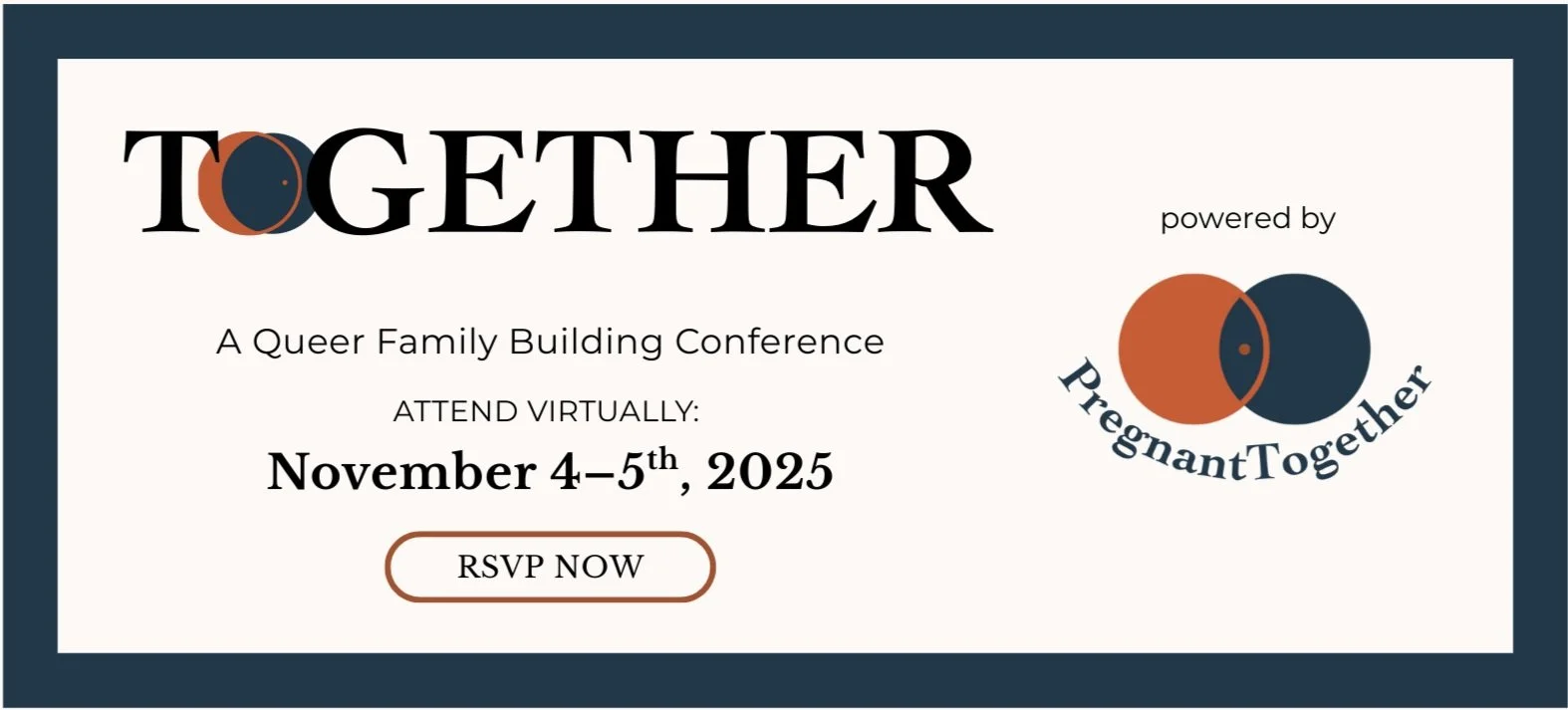 PregnantTogether is proud to host the inaugural conference, TOGETHER, which brings community members, experts, and organizations into conversation about building families with pride and power. Whether you’re considering family-building, actively navigating fertility and legal steps, or supporting queer parents as a professional*, this event is for you!