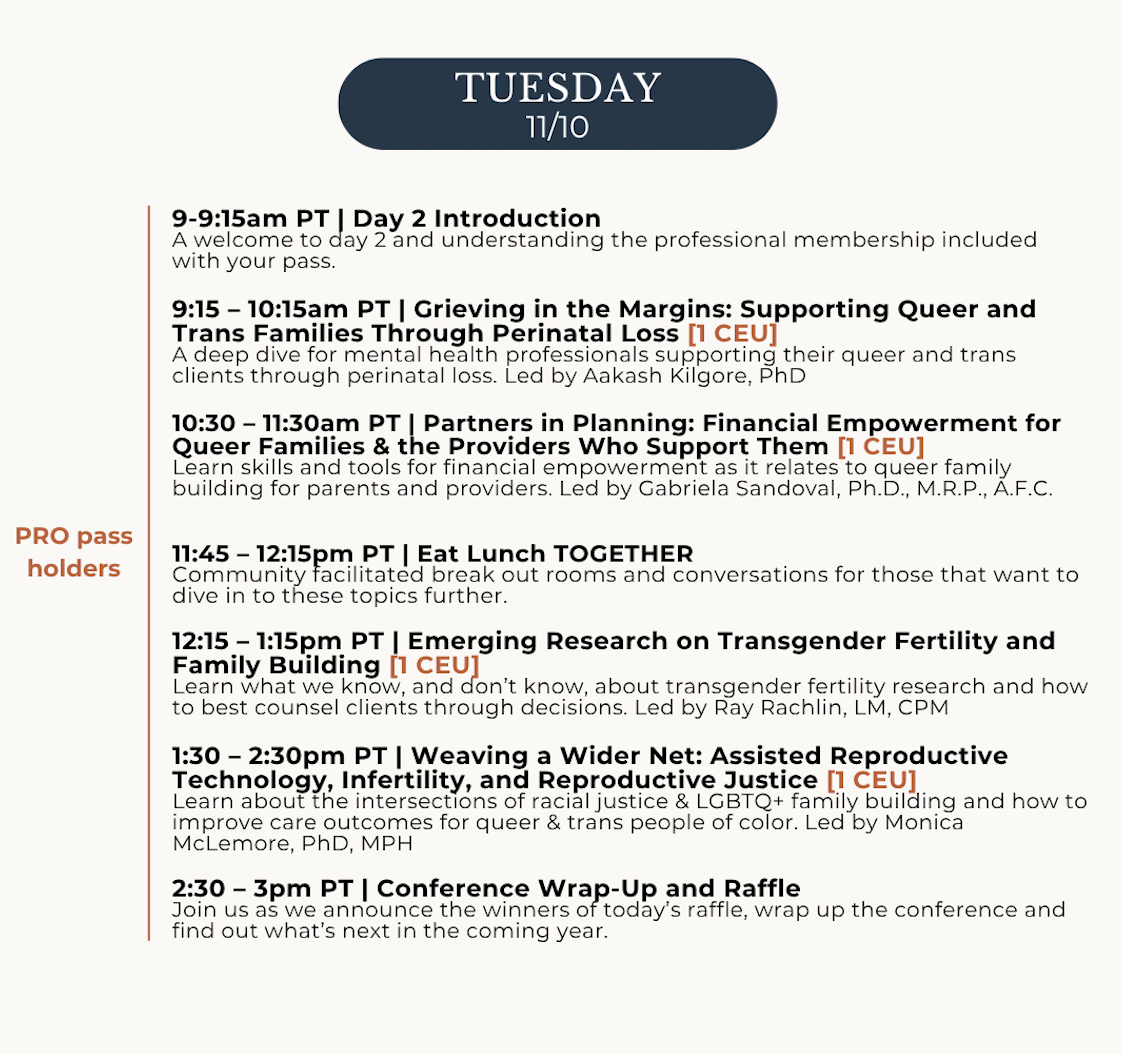 Whether you’re considering family-building, actively navigating fertility and legal steps, or supporting queer parents as a professional*, this event is for you!